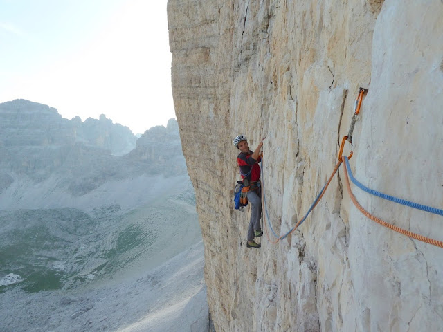 | Die Querung über die Bänder zum Einstieg ist krass exponiert, aber gut gesichert und daher eigentlich problemlos. |