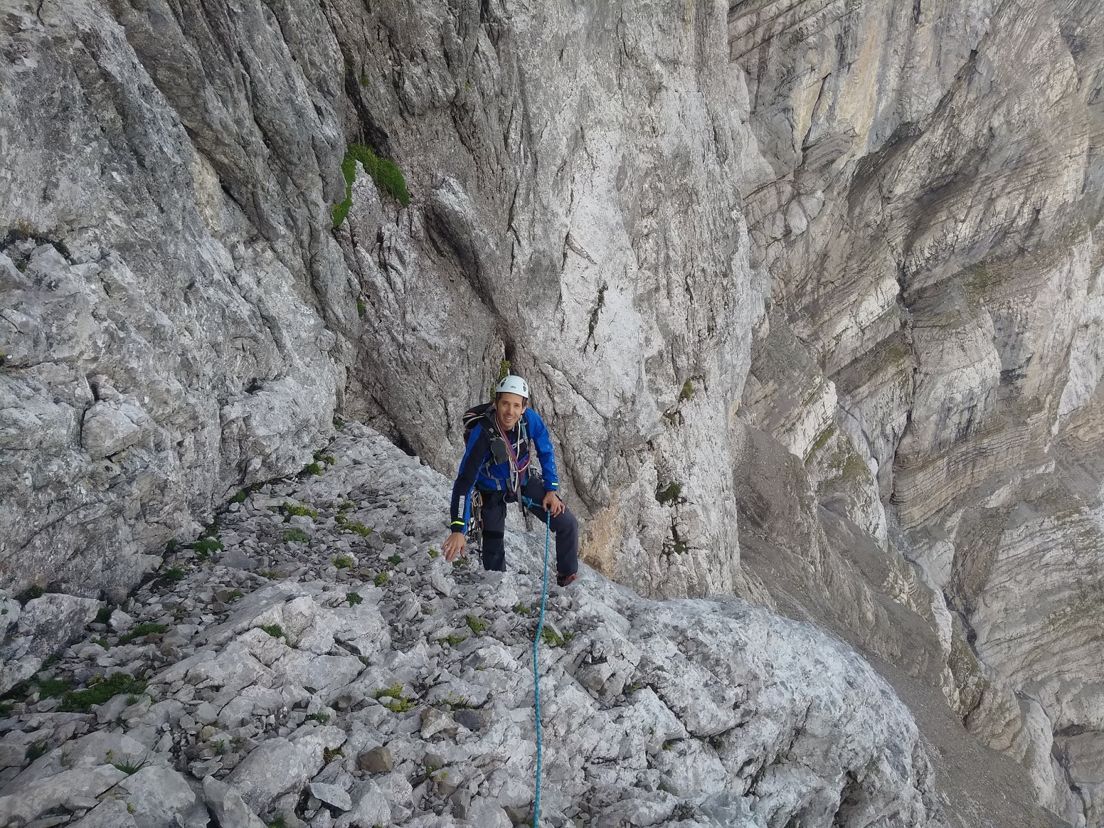 | Am Routenende. Hier über den Grat ginge es (nicht trivial!) weiter Richtung Gipfel. Oder auch zu Fuss ins Tal. |