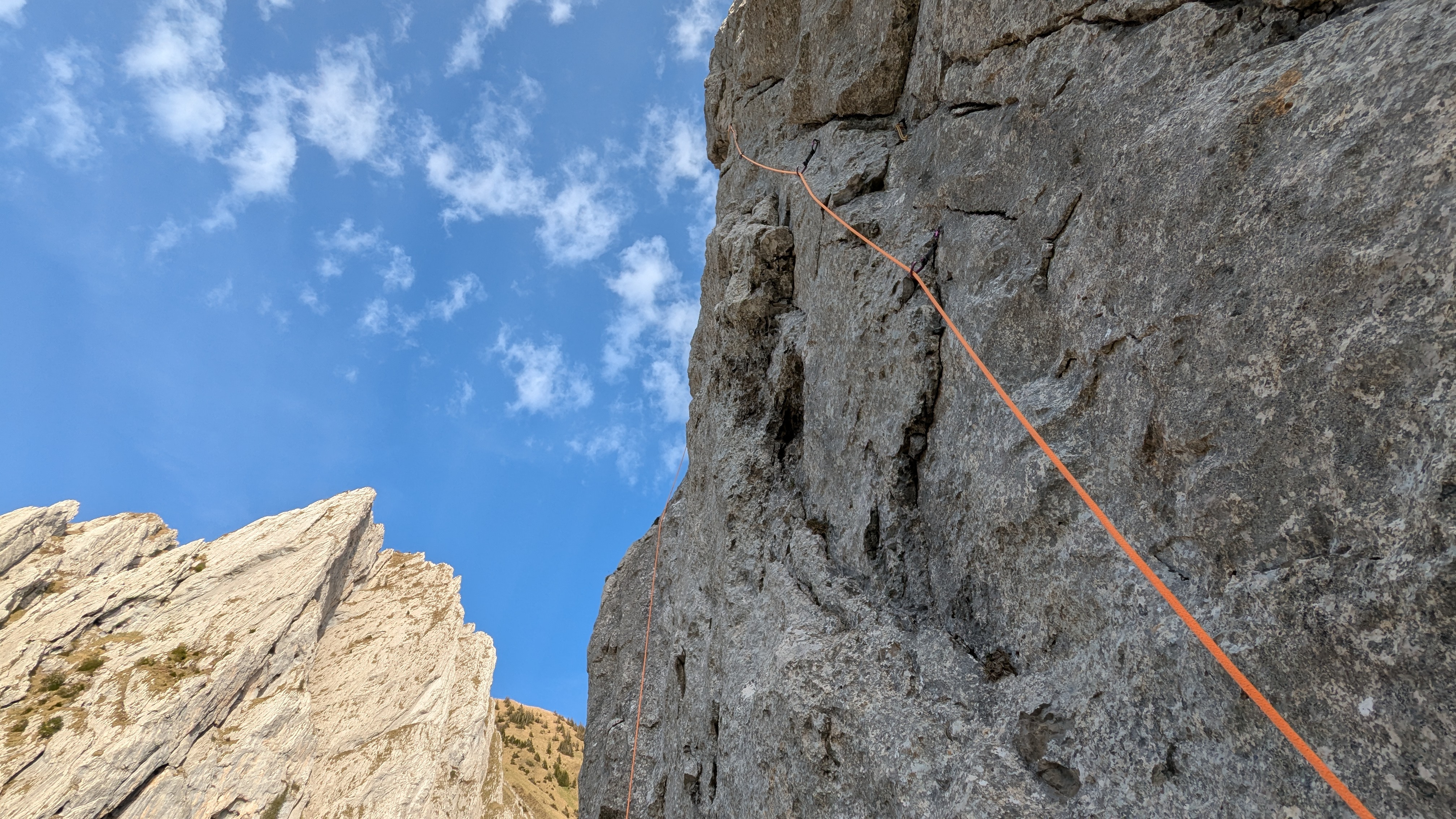 L3, 20m, 6a+: Der Start ist etwas komisch, denn linksrum befindet sich ein tief steckender BH, zum Klettern einfacher wäre es aber rechtsrum. Item, es folgt steile, griffige und recht athletische Kletterei an Henkelschuppen und Rissspuren. Die Absicherung ist sehr gut mit BH, teils könnte man sich auch an den noch steckenden, originalen NH behelfen. Teils sind die BH jedoch hoch gebohrt. Und das sagt der berüchtigtste BH-Hochbohrer der Alpennordseite, das will wohl etwas heissen 😎. Für kürzer gewachsene gibt es m.E. recht zwingende Stelle nahe der Hauptschwierigkeit. Das Umkehrmaillon im Haken darunter spricht jedenfalls Bände... wobei es gutes Sturzgelände ist und auch kein weiter Abstand, man kann riskieren und es ist "gut abgesichert", aber A0 geht da nicht. Am Ende dann einfachere Linksquerung zu Stand mit Muniring und BH.