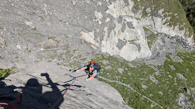 Plaisir oder Extrem? Das ist eine Frage, welche sich gar nicht so einfach beantworten lässt. Komplett frei gemacht (was sehr gut möglich ist), ist auf jeden Fall ein Kletterkönnen nötig, welches den Plaisirbereich klar sprengt. Und auch einige andere Seillängen mit kräftiger Leisten- und Querschlitz-Kletterei im Bereich 6c/+ sprechen eher jene an, welche sich regelmässig in der Vertikale bewegen. Eines ist sicher: die Absicherung ist in den schwierigen Passagen eng bis sehr eng (Niveau xxxxx) gehalten. An ein paar wenigen einfacheren Stellen gibt's auch mal weitere Abstände (Niveau xxx-xxxx). Mit mobilem Material kann man jedoch (auch dort) nichts anfangen. Die Kletterei ist echt cool und hat mir sehr viel Spass gemacht. Ein paar Leistenpassagen an Wulsten sind etwas splittrig, zwischendurch gibt's auch mal etwas Botanik und einfaches Bruchgelände, abschnittweise ist der Fels etwas staubig-belagig. Insgesamt überwiegt aber schon tolle Kletterei in prima Fels. Topos und weitere Infos zum Gebiet bzw. der Route findet man im Plaisir Ost vom Filidor-Verlag, oder im SAC-Tourenportal.